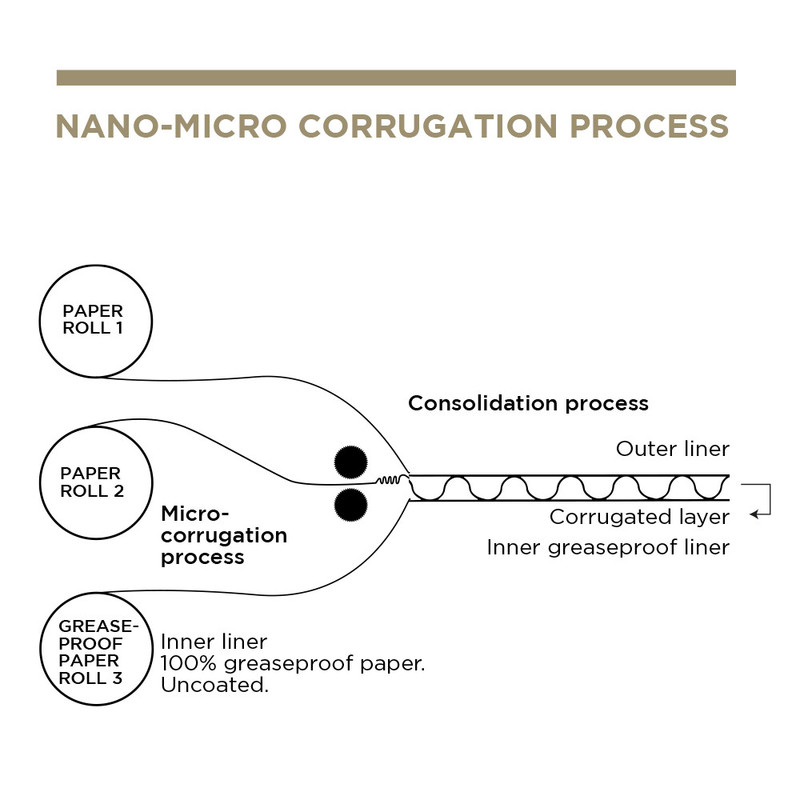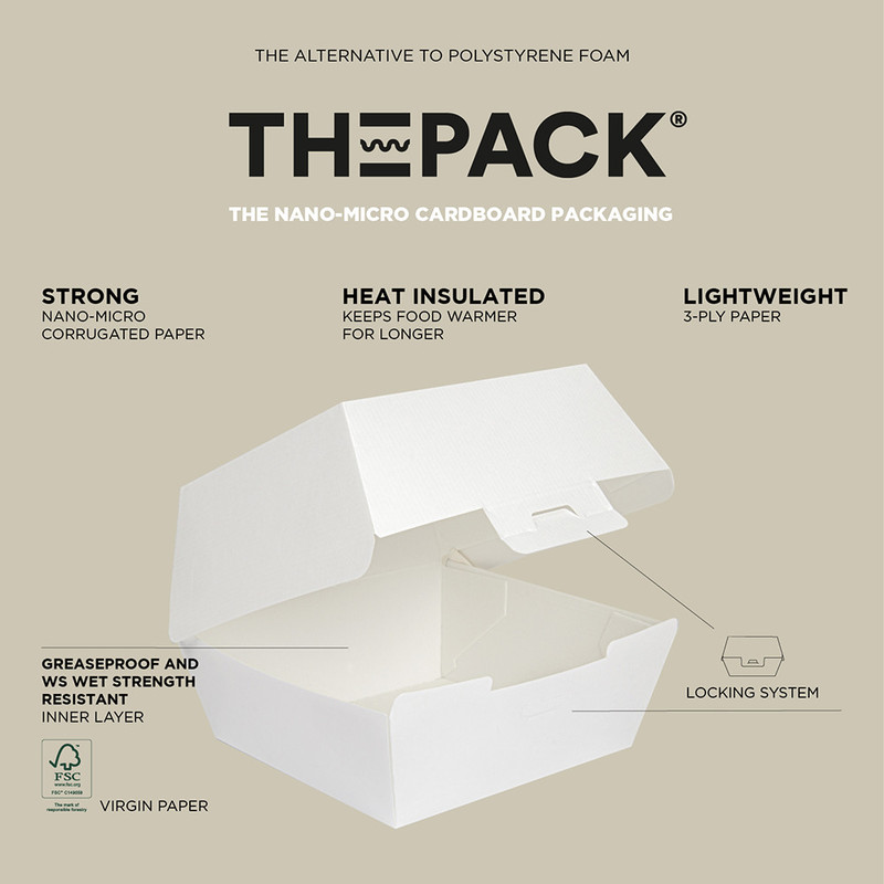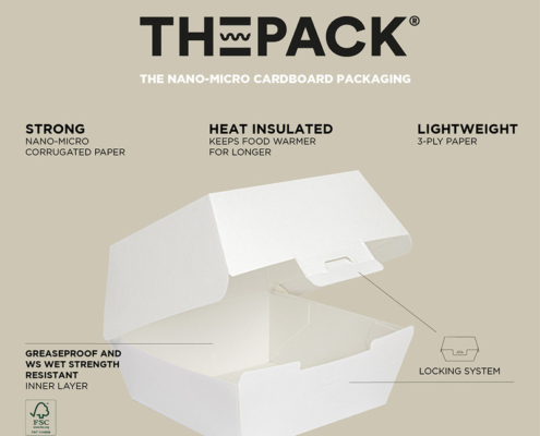 Linija The Pack: Kartonasta embalaža imenovana The Pack iz NANO-MIKRO valovitega kartona je TRŠA od klasičnih kartonastih proizvodov, in posledično dalj časa ohranja toploto jedi. Poleg tega pa je kljub temu, da je trša in tro-slojna precej lažja od teh, ki jih poznamo na trgu. Gretje? Linija The Pack je primerna uporabi v mikrovalovni pečici. In sicer na 9 minut na 1000W ali na 7,5 minut na 1200W. Izjema so artikli, ki poleg kartona vsebujejo tudi folijo (embalaže z oknom) – te niso primerni. Maščoba? The Pack linija je odporna na maščobo.